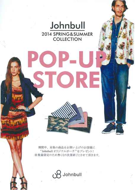 Johnbull POP-UP STORE 2014年03月07日 BAS STAFF BLOG,S・PARK,NAKASYO 本日8日よりJohnbull2014春夏商品を10000円(本体価格)以上お買い上げのお客様にJohnbullオリジナルポーチをプレゼント!! ※数量限定のため無くなり次第終了とさせていただきます。